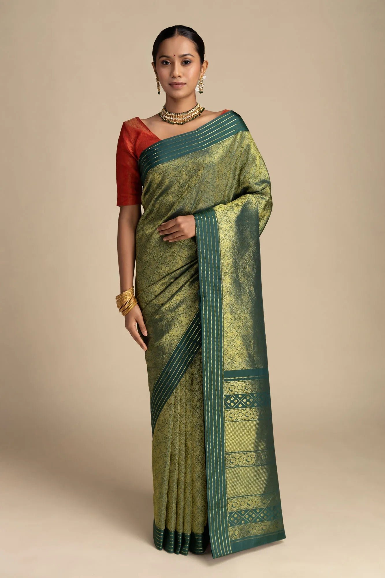 Crafted from 100% pure silk using the traditional extra weft Jacquard weaving technique, this handwoven saree harmonizes classic artistry with contemporary elegance. Embrace the vibrancy and strength of the modern woman with this beautiful representation of cultural heritage.