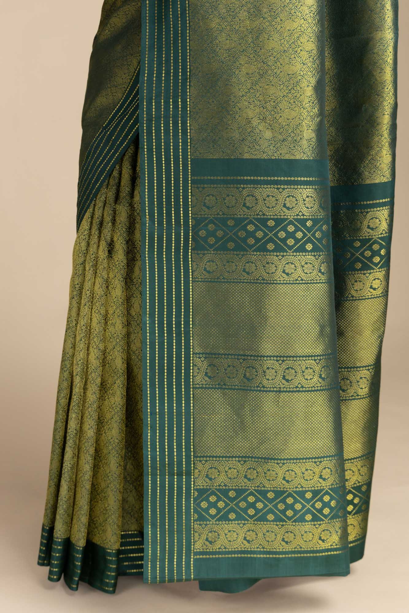 The intricate border showcases Neetru Varisai (linear lines) and Vattam Suzhi (circular geometrics), while the pallu is detailed with Samanthi poo (Marigold) motifs, zari twill lines, and floral ornamentation that resonate with the border’s patterns.
