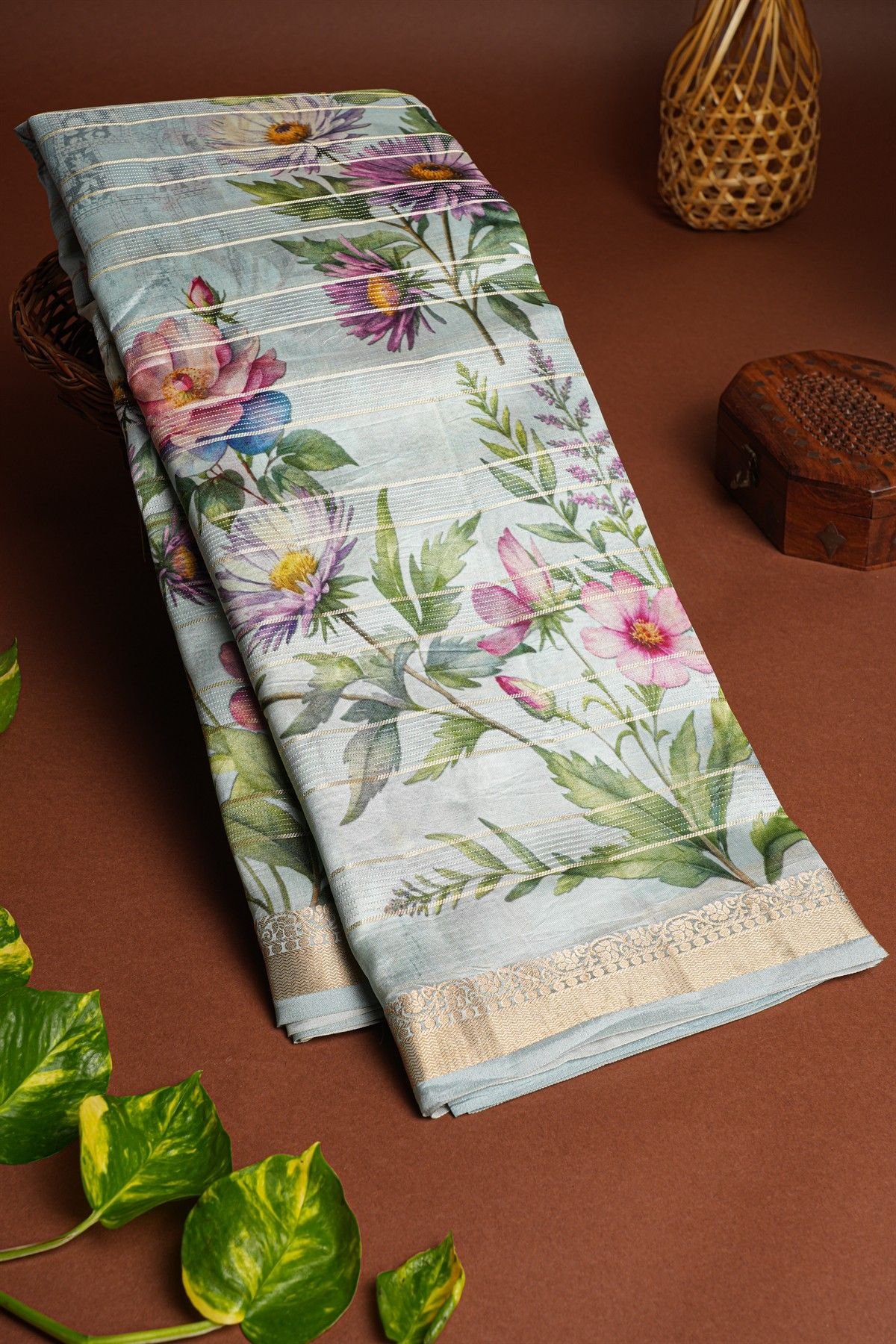 Embody the essence of tradition with our Matka Silk Dual Colour Saree flaunting florals and leaves in print. The contrast border ornamented with zig-zag lines and florals exudes poetic elegance. To complete the regal finish, the zari lines pallu coupled with the florals and leaves in print blouse resonates rich heritage.