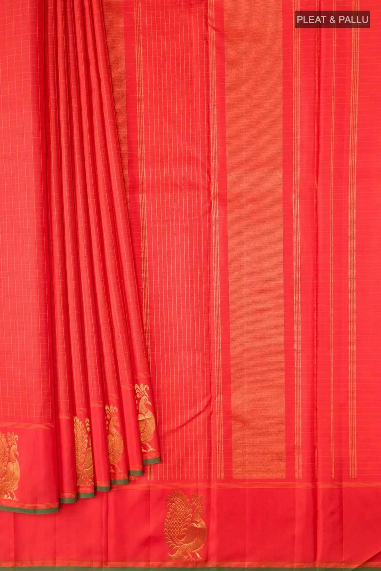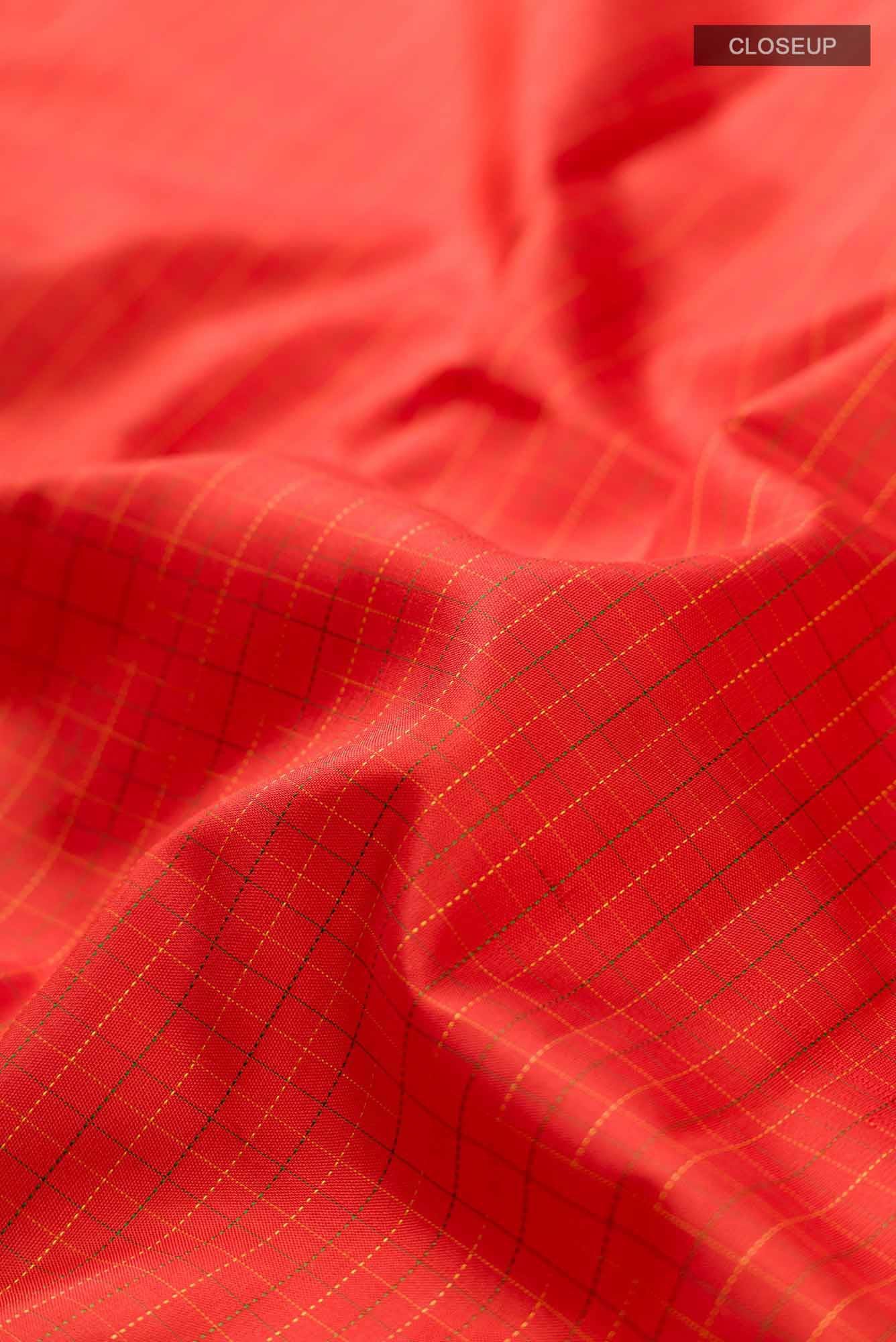 Orange Kanchipuram Silk SareeChecked design on the body and Zari Border. Includes unstitched blouse.