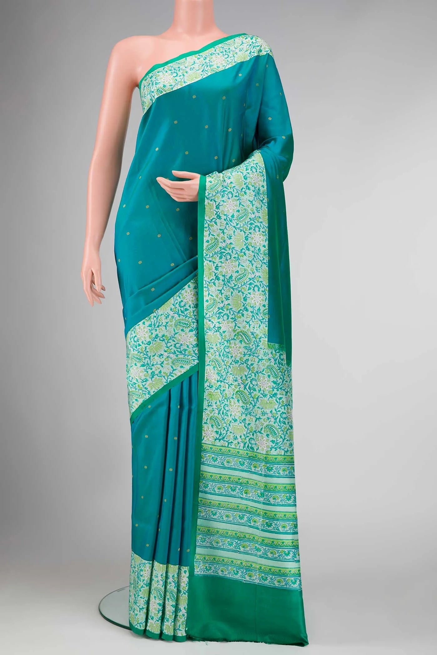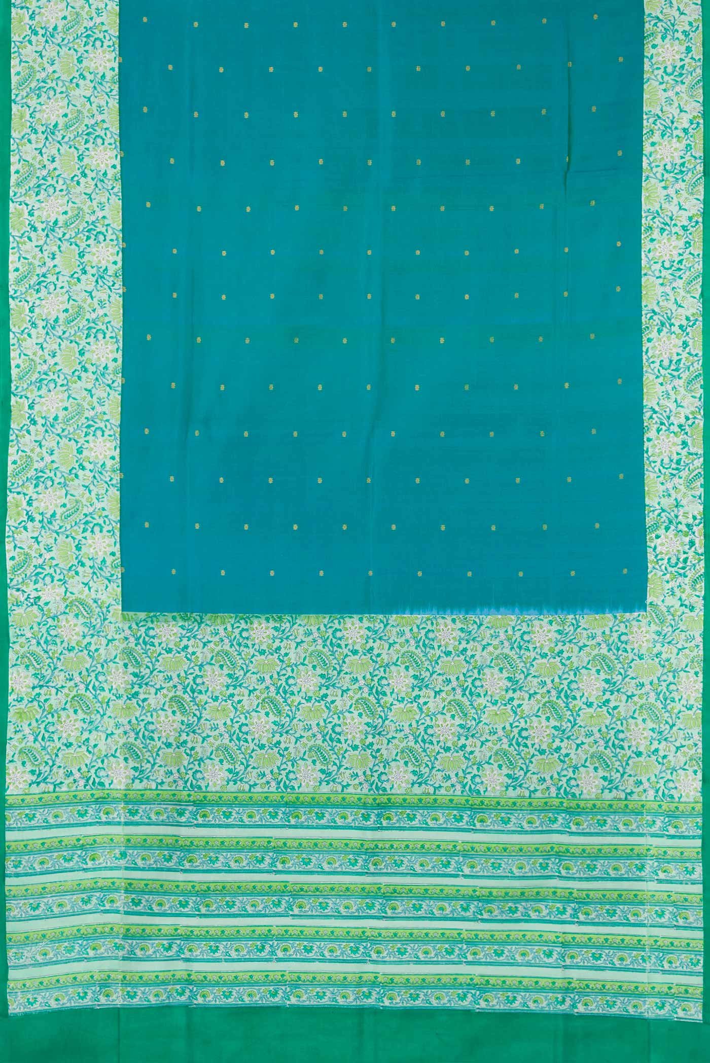 Peacock Blue Dual Tone Kanchipuram Silk Saree with Zari Butta on the body and Printed Border. Includes unstitched blouse.