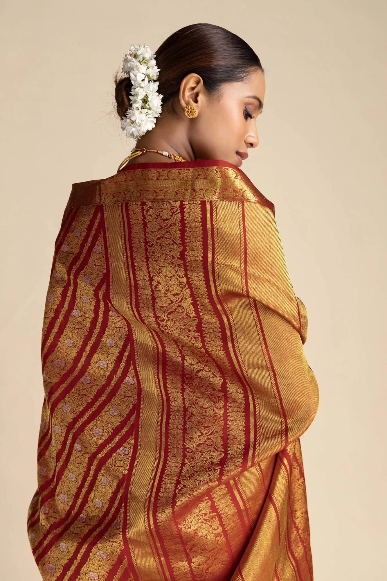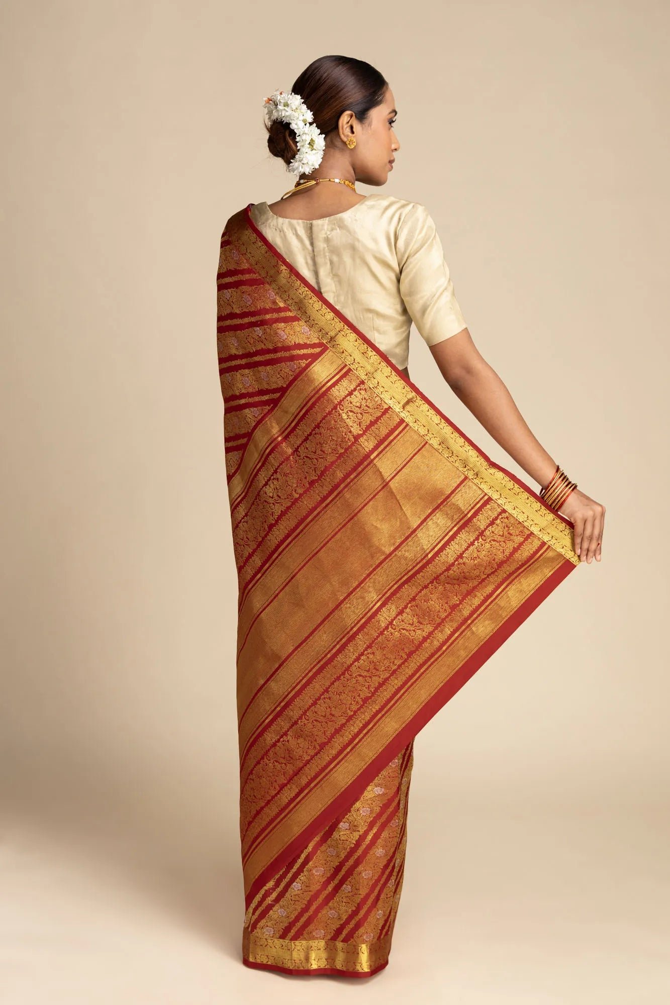 The pallu, adorned with vibrant Samanthi poo (marigold) and twill lines, exudes serene elegance. Handwoven from 100% pure silk, this saree not only reflects timeless Kanchipuram beauty but also resonates with the wearer’s grace, empowering them to embrace their natural charm.
