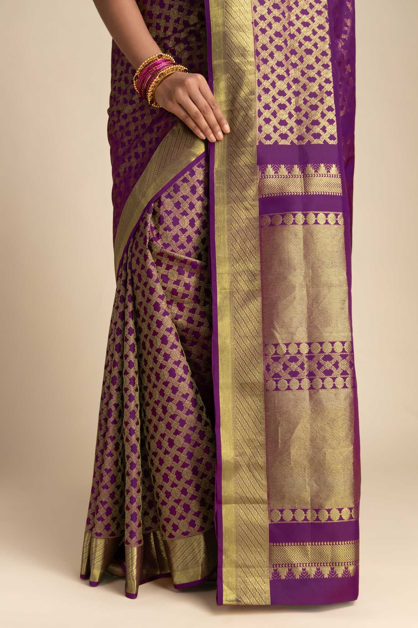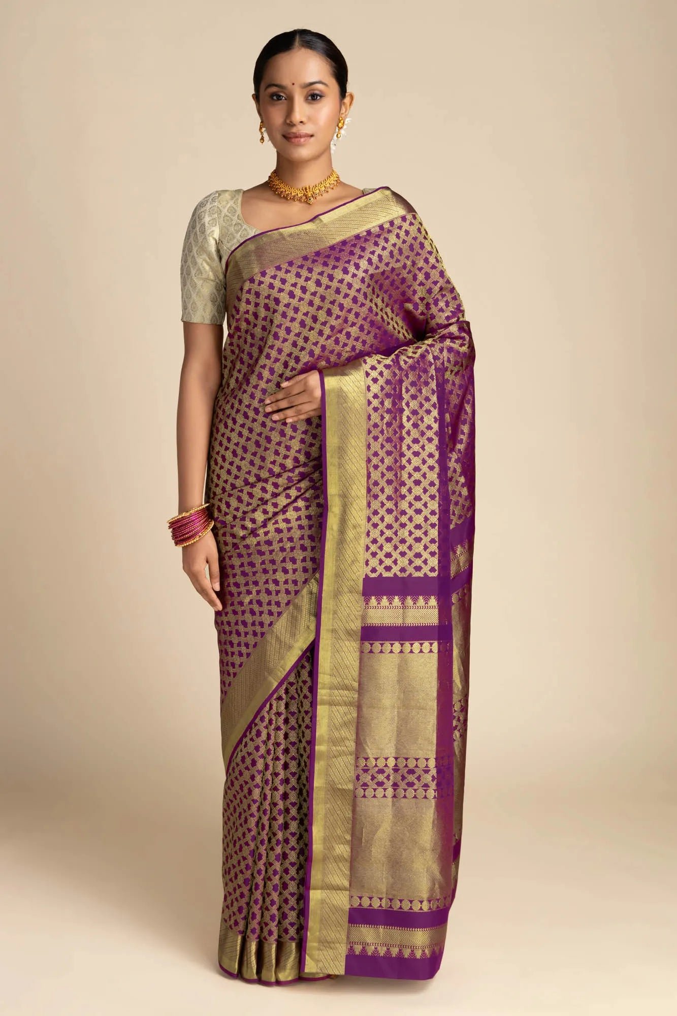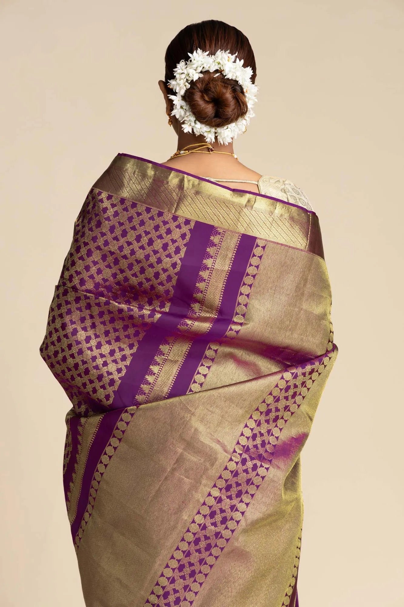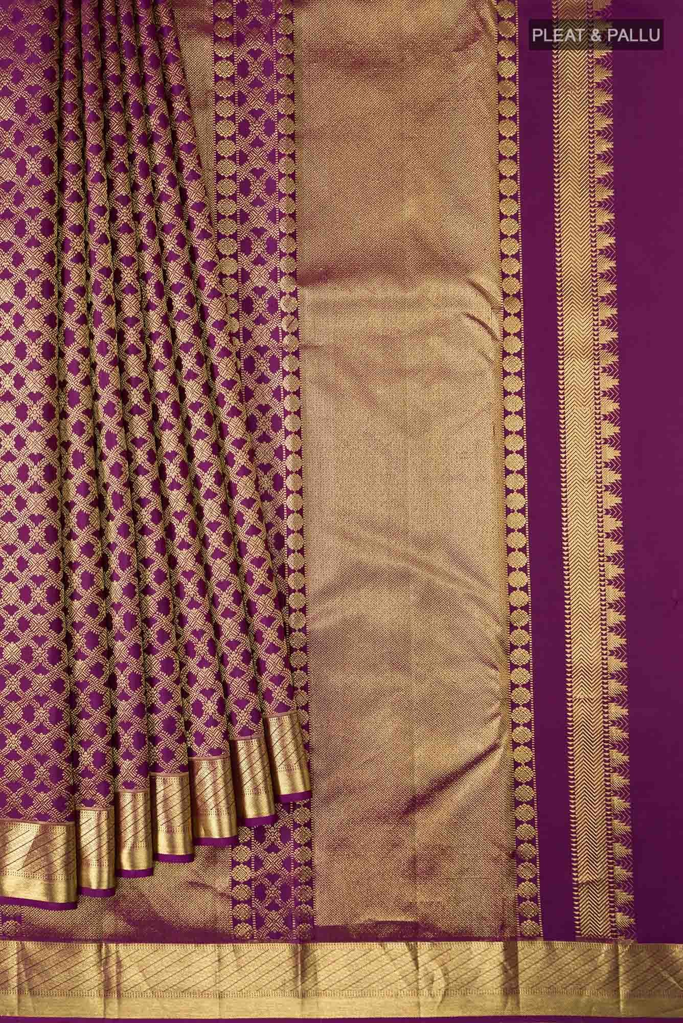 The border features geometric patterns and twill lines, adding a harmonious contrast. The pallu features exquisite craftsmanship, adorned with temple patterns, chevron bands, and Mayilkan (Peacock Eye) accents, symbolizing beauty and wisdom, alongside delicate floral motifs. Woven from 100% pure silk, this saree resonates with the strength and spirituality of modern women, offering both timeless grace and cultural depth, perfect for festive and ceremonial occasions.
